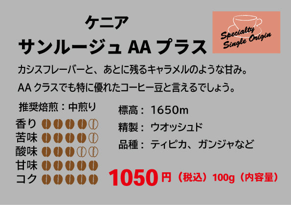 生産量が減少し、希少になりつつあるケニアのコーヒー。 中でも最高級のクオリティを誇るのが、「サンルージュ AA プラス」です。 その飲み口は、滑らかでクリーン。しかも濃厚なコクがあり、感覚のある味わいが思い出していきます。気合を入れて作業に取り込む前に、ぴったりなコーヒーです。